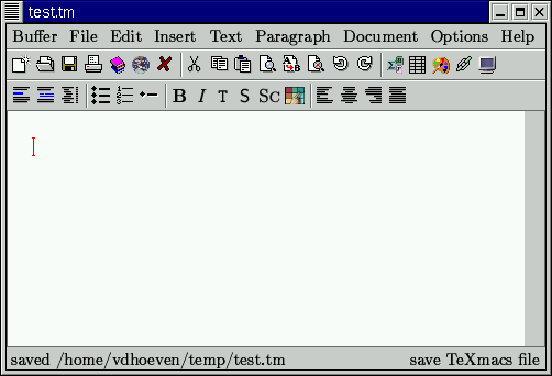 We notice that you should always let your file name end by the .tm suffix, so that anyone can recognize that your file is a TeXmacs document. After giving your text a name, your main window should look like